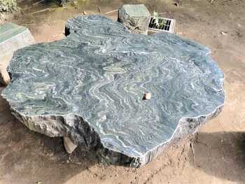 You'll find tables and chairs made of a stone that looks like emerald green.