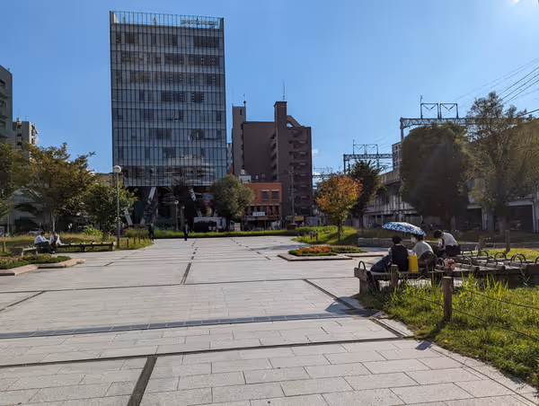 博多駅近くの音羽公園は、空が見える広々とした休憩場所。ベンチが多く、お弁当や待ち合わせに最適。