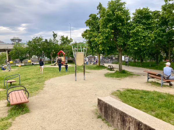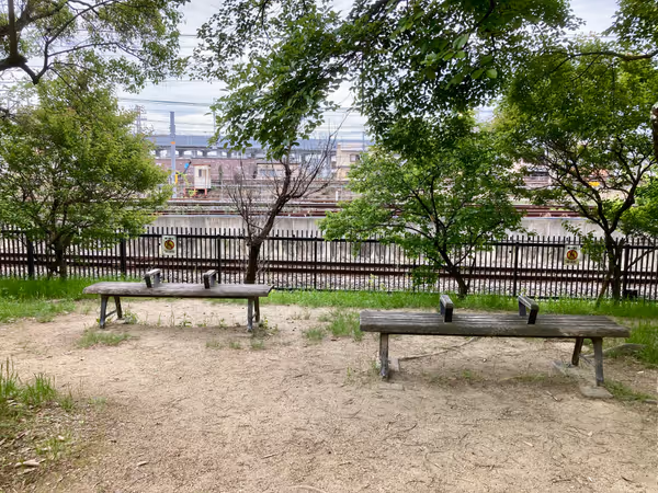 - 【梅小路京都西駅】梅小路公園 JR線路側の遊歩道の休憩場所