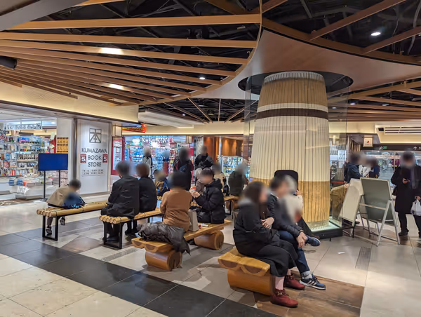 屋内スポット1 min a pie屋内京都駅ポルタ地下街、くまざわ書店付近のベンチが待ち合わせに最適。和風空間で休憩もできる。