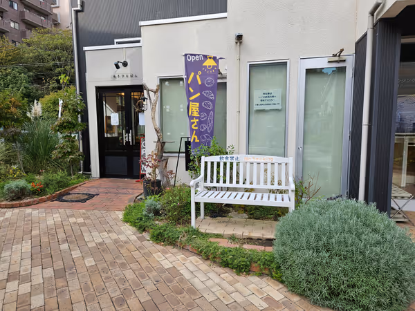 パン屋の前に23人掛け木製ベンチ。飲食禁止。