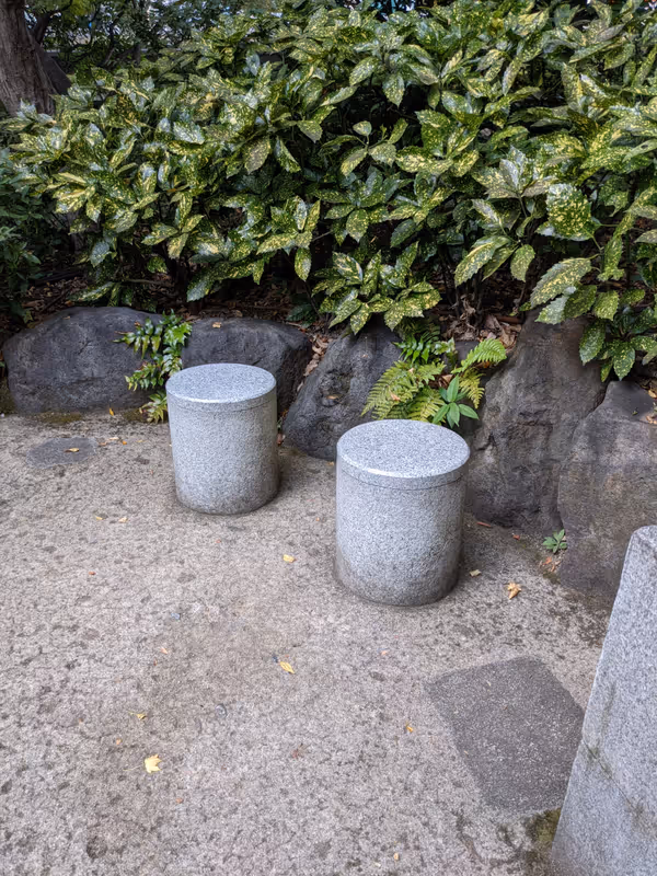 ビル街の静かな休憩所。石ベンチでゆったりと過ごせる。人通り少なく、くつろぎたい時に最適。