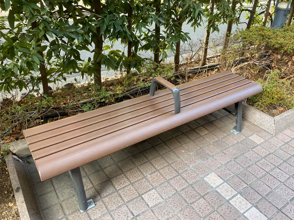 阪神梅田本店横の歩道にベンチ。待ち合わせや休憩に便利。アーバンな雰囲気で、広々としていて快適。