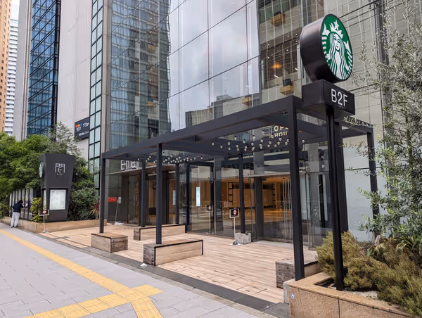 梅田駅周辺、スタバ前のベンチやデッキで休憩できる。待ち合わせやランチに便利。