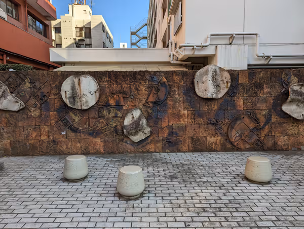 東陽町駅南のポケット広場に、アートな空間と休憩スペース。東陽橋のレリーフも。