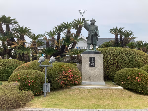 駅前の広場に設置。木陰で日差しを避けられ、大石内蔵助の銅像も。
