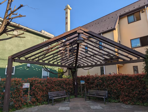 江古田駅周辺で現地調査したベンチの中から、今の時間に日陰のベンチでテイクアウトを楽しめる休憩スポットを紹介しています。