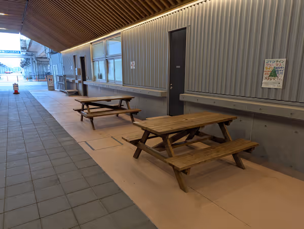 小松駅前Komatsu九、ギャラリー前の休憩スペース。テーブルやベンチ、トイレも。待合室もおすすめ。