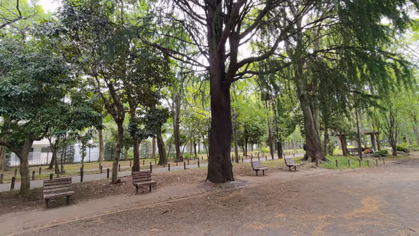 高田馬場近くの戸山公園は、広々とした憩いの場。ベンチ、遊具、散歩道があり、ピクニックや休憩に最適。