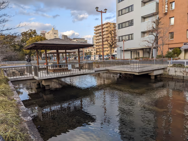 岡山駅近くの西川緑道にある水上テラス。東屋のベンチで休憩やデートに。錦鯉も楽しめる。