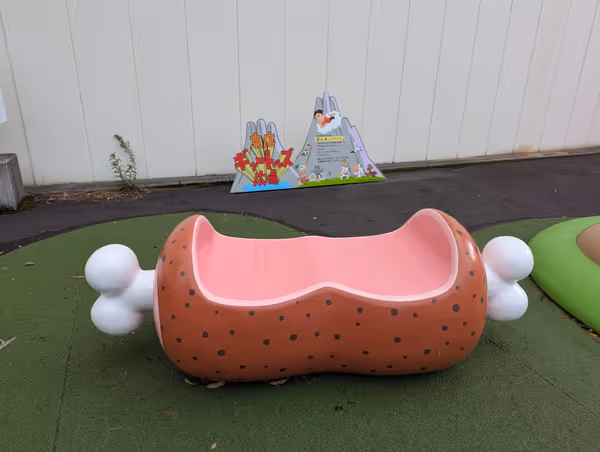 松江京店商店街に「ほねつき肉」オブジェのギャートルズ広場。休憩に◎。作者は松江出身。