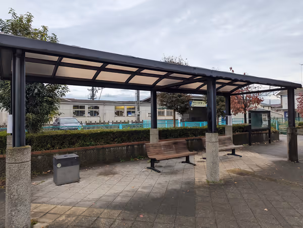 おもちゃのまち駅西口、ポート屋根下のベンチは休憩や待ち合わせに最適。雨や日差しを避けられます。