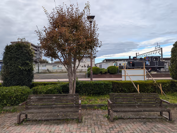 おもちゃのまち駅東口、時計塔とSLが目印。ベンチで休憩可能。