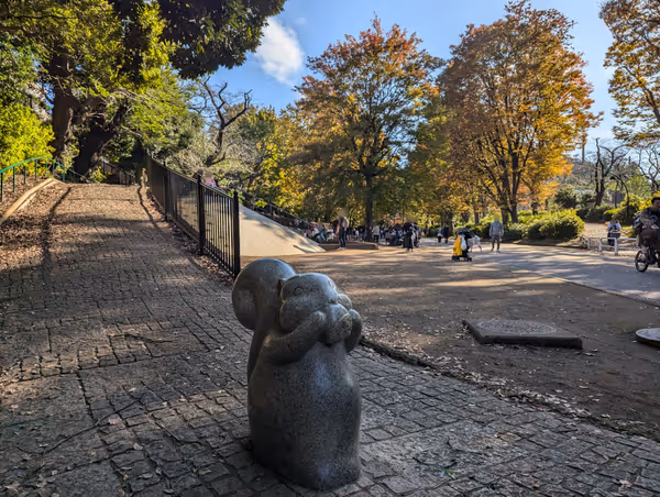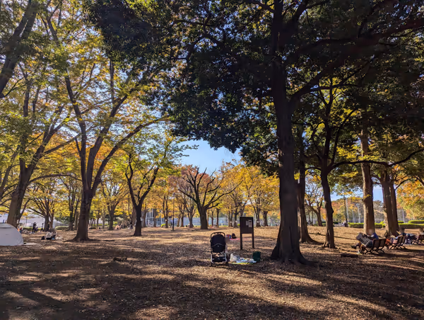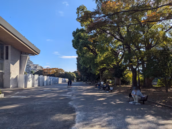 駒沢大学駅周辺で現地調査したベンチの中から、今の時間に日陰のベンチでテイクアウトを楽しめる休憩スポットを紹介しています。