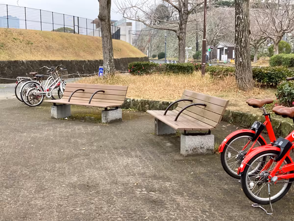 舞鶴公園にシェアサイクルポート。近くに公衆トイレあり。赤い自転車で利用可能。