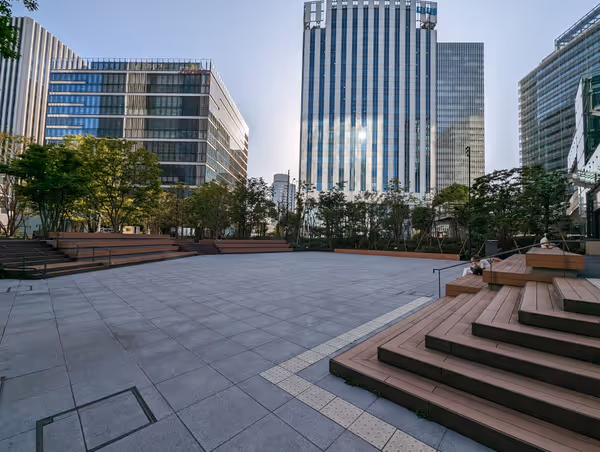新高島駅4出口近くの広場。開放感があり、腰掛け場所やフリーWi-Fiも。テレワークにも◎。