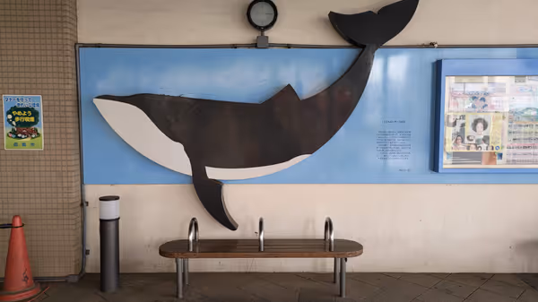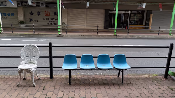 東中神のくじらロード商店街にあるバス停風ベンチは休憩に◎。近くのくじらのベンチもおすすめ。