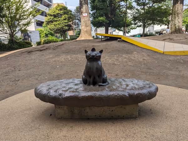 中村橋駅南口のベンチは、待ち合わせや食事に便利。飛猫「ニャンピー」像や井戸もあり、休憩におすすめ。