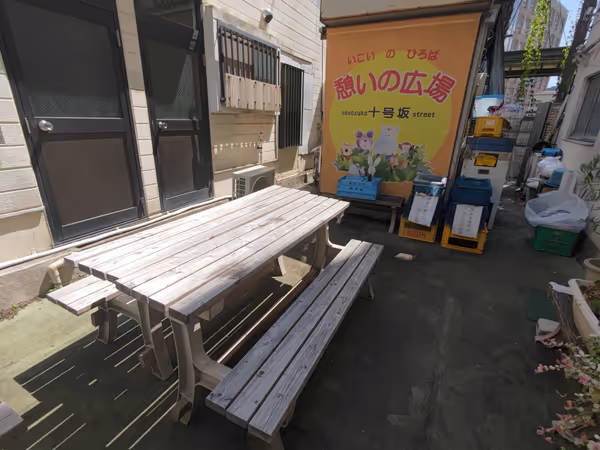 笹塚十号通り商店街に休憩スペース「憩いの場」あり。テーブル、ベンチ、夏季はミストも。テイクアウ...