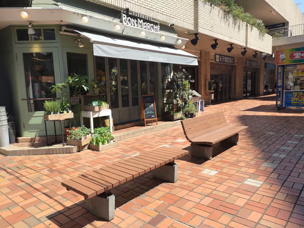笹塚駅前のフレンテ笹塚裏手に、ミニテーブル付きのベンチあり。テイクアウトや待ち合わせ、テレワー...