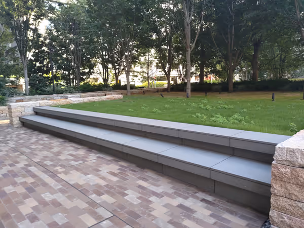 日比谷フォートタワー新橋寄り入口付近に休憩スペース。石材ベンチと芝生。内幸町駅周辺の休憩に。